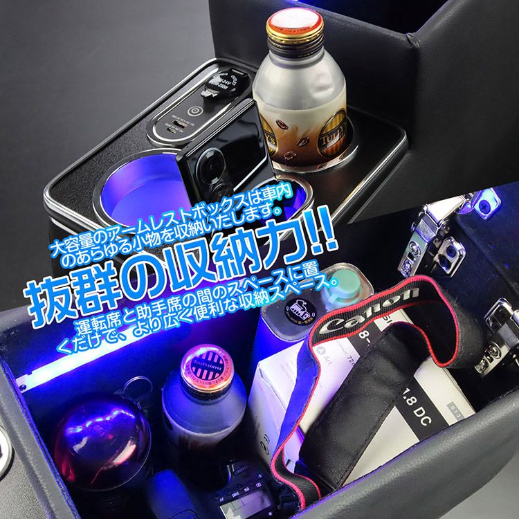 ■【高級感アップ】 表面に高級レザーを使用し、柔らかくて肌触りの良い仕上がりです。コンソールボックス 内部にLEDライトが付属しているので、車内の高級感が増しドレスアップできます。