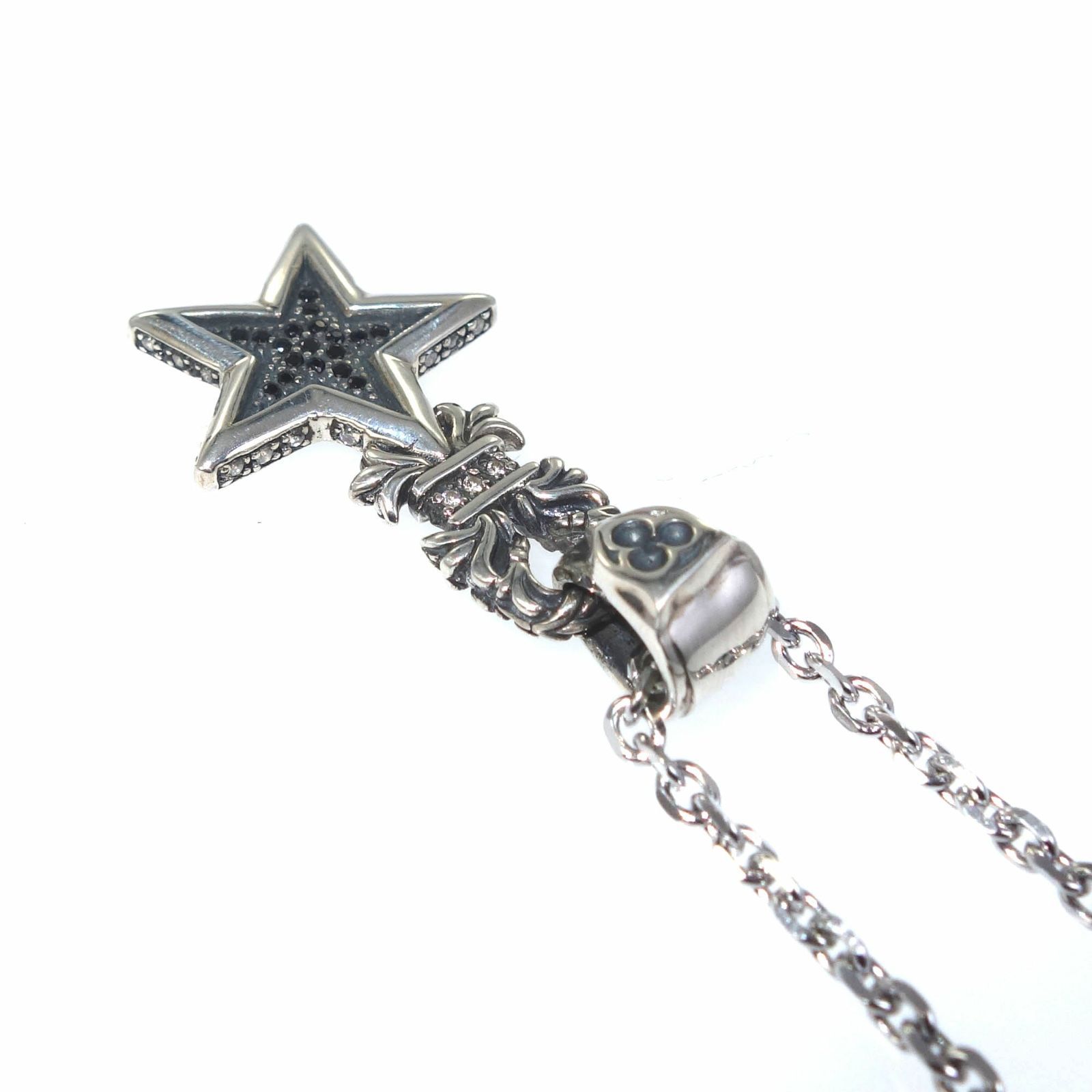 A monochrome star pendant that captures the night sky in silver. Lavishly paved with jet-black and clear cubic zirconia, the star sits in a finely sculpted silver frame and catches different light with every turn. The bail is adorned with tracery and delicate botanical motifs—decorative yet impeccably refined. Intricate engraving contrasted with scintillating stones elevates the piece to wearable art. Hand-finished one by one in our partner atelier, the SV925 balances deep oxidation with a lustrous shine, instantly polishing any look. Sophisticated for everyday, singular for special occasions—an “art piece to wear.”