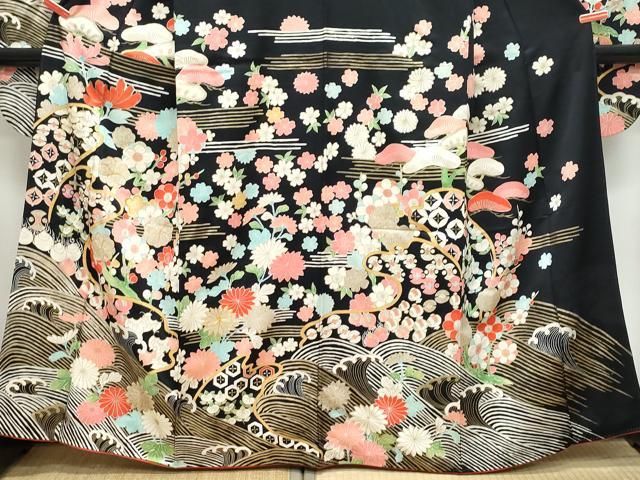 平和屋着物 豪華振袖 駒刺繍 立波宝尽くし花文 黒地 金彩 正絹 vf