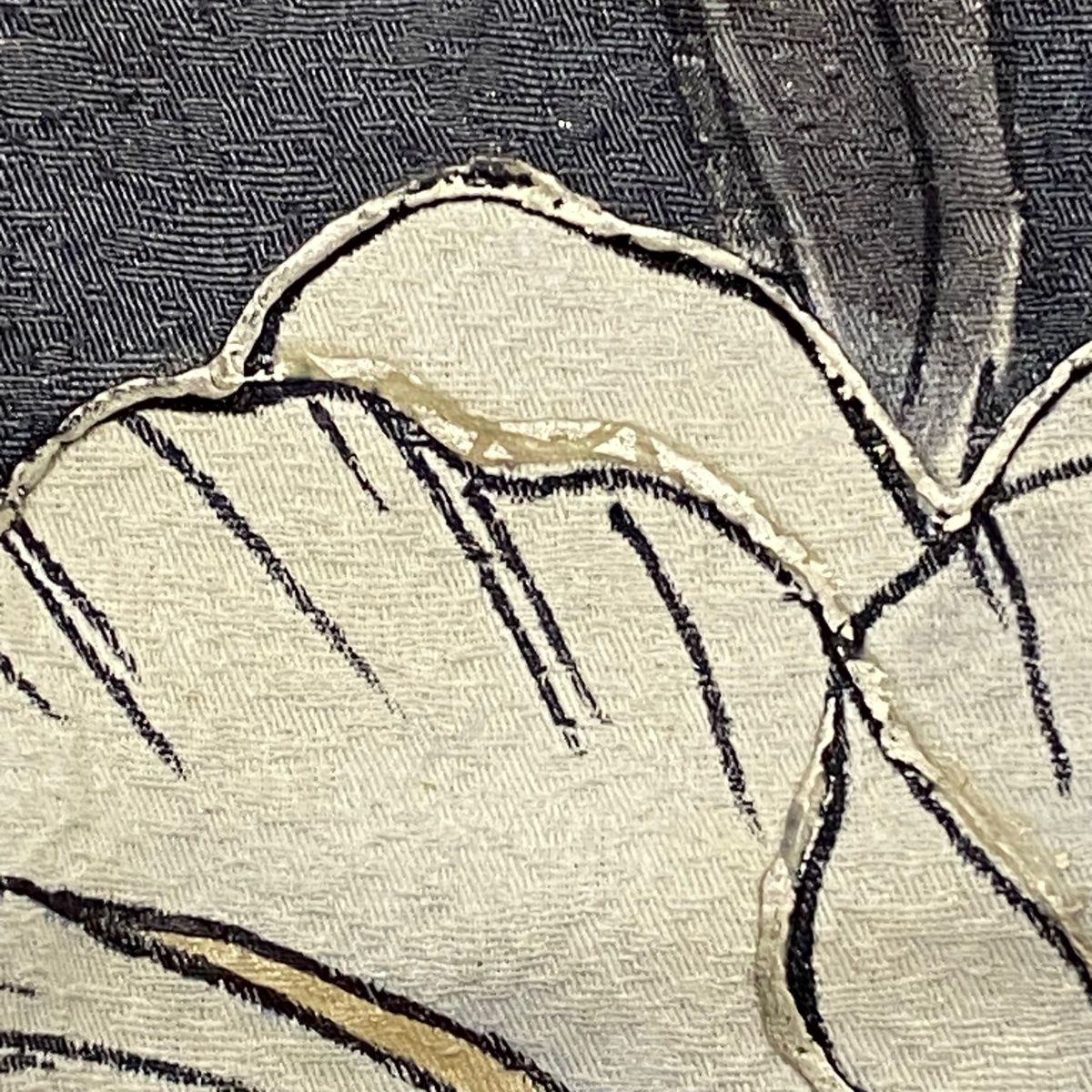 両前袖と右胸と左衿にシミ、両袖口中に薄汚れ、表地所々にシワ、表地所々に銀彩の剥がれがございます。