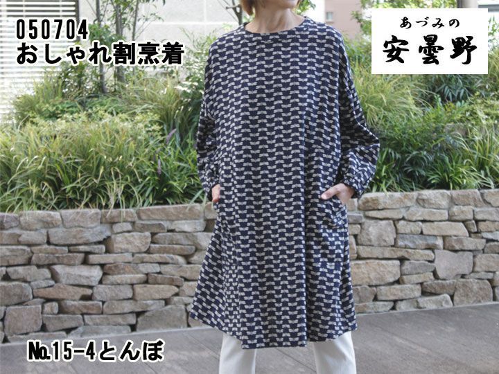 051204-15-4とんぼ 安曇野 F ゆったり 婦人服 大きい 11号~13号相当 藍染め風 和柄 おしゃれ割烹着 久留米絣パッチワーク ホームウエア