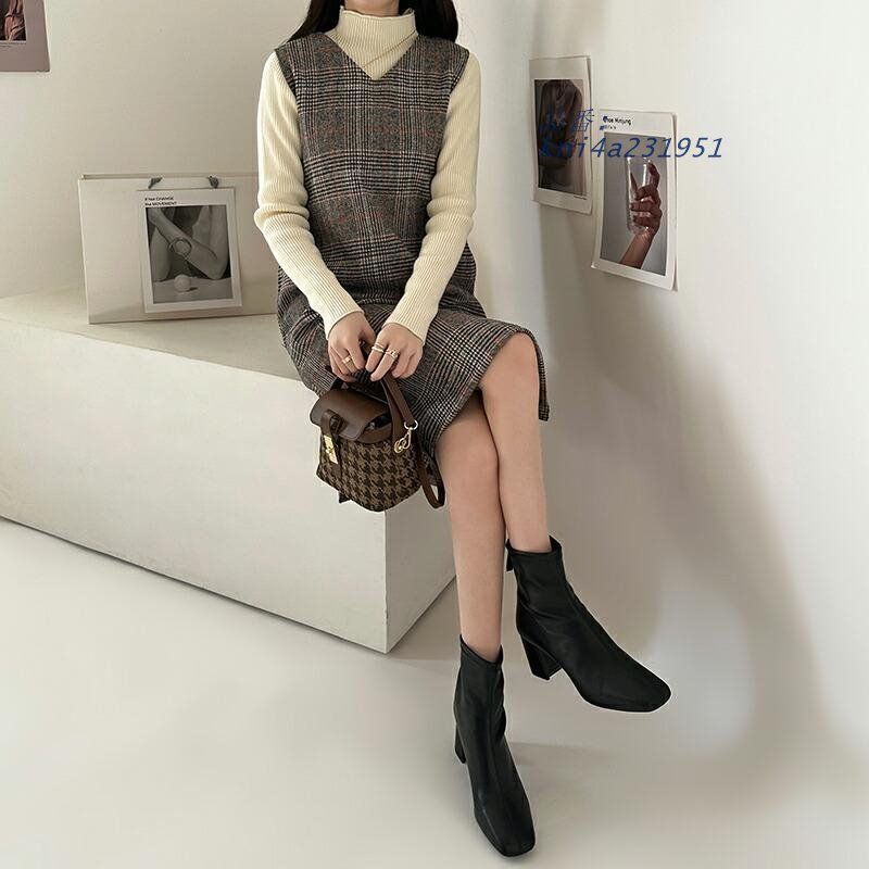 ジャンパースカート Vネック 大人 ジャンスカ レディース ジャンスカワンピース ワンピース ロング スカート チェック柄 選べる長さ ミディアム きれいめ 韓国 kni 4 a 231951