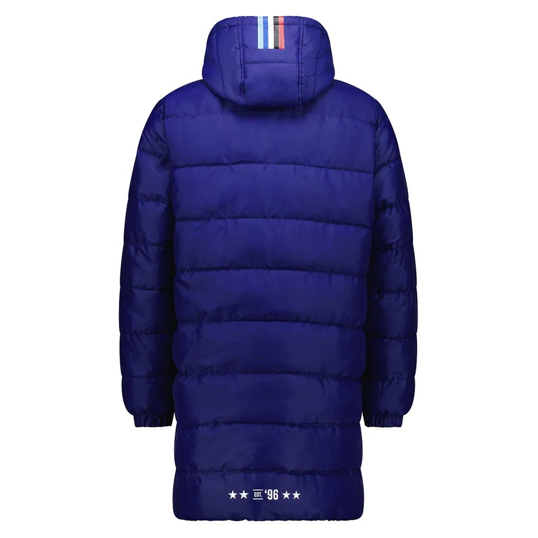 トグル留め具付きの裏地付きフードと、保温性を高めるキルティング裏地が付いています。左胸にチームロゴがあしらわれています。