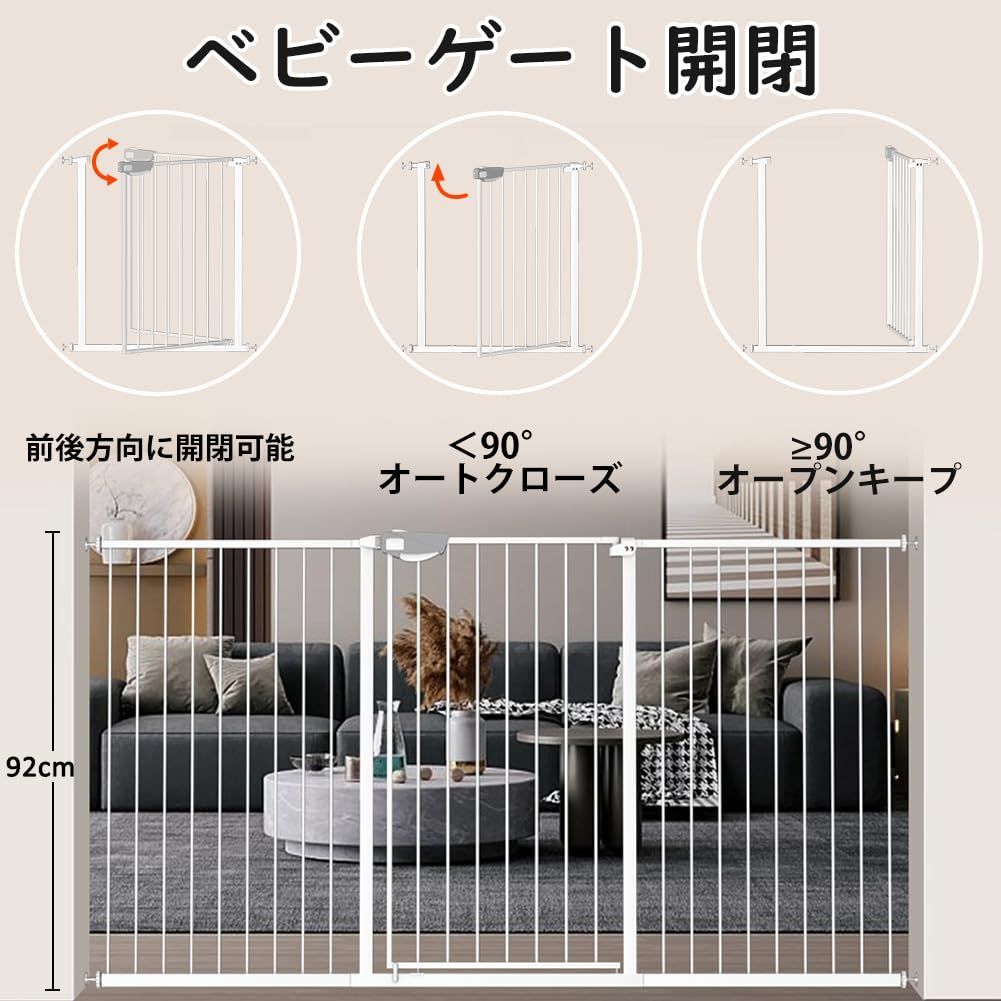 【ベビーゲート 超ロング】リニュアルした高さ92cmです。79から最長は219cmまで設置できる超ロングゲートです。どんなに幅広くて、長い所でも、100cm以上や、160cm以上、170cm、180cm、200cmなど様々のサイズに合うように設置することができるロングゲートです。ご購入時にサイズを迷ったら、いつでもSeogvaゲート店にご相談してください。