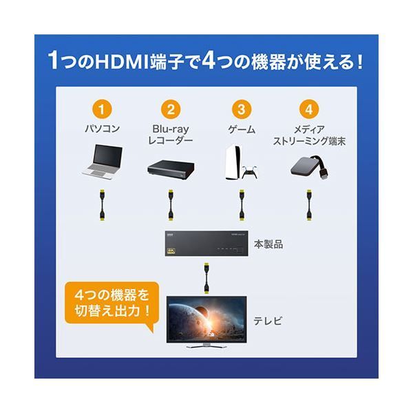 ●HDMI機器4台の映像・音声を1台の8Kディスプレイ等に簡単に切替出力できるHDMI切替器です。