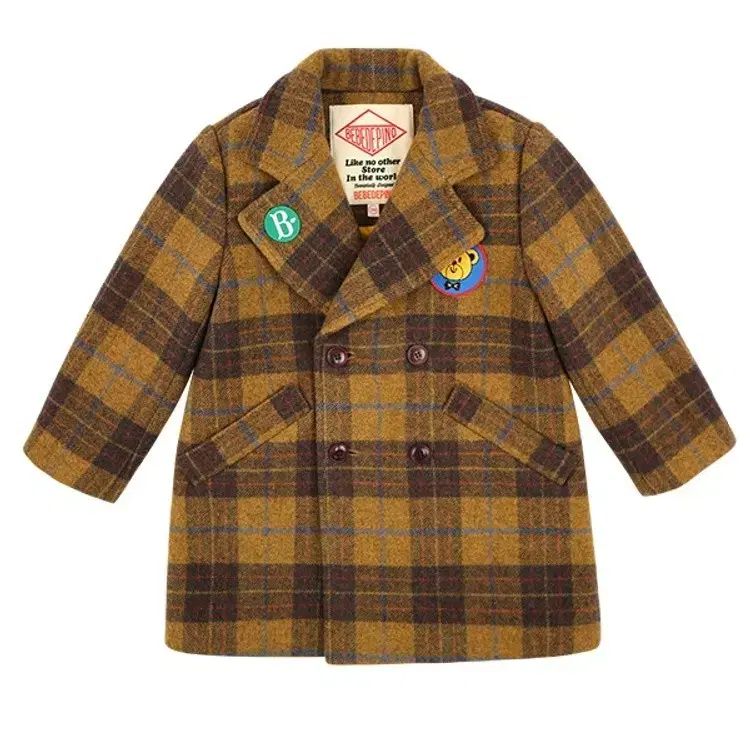 チェック柄とキュートなクマのパッチがポイント。ウールをブレンドして作っているので、暖かくて高級感があります。