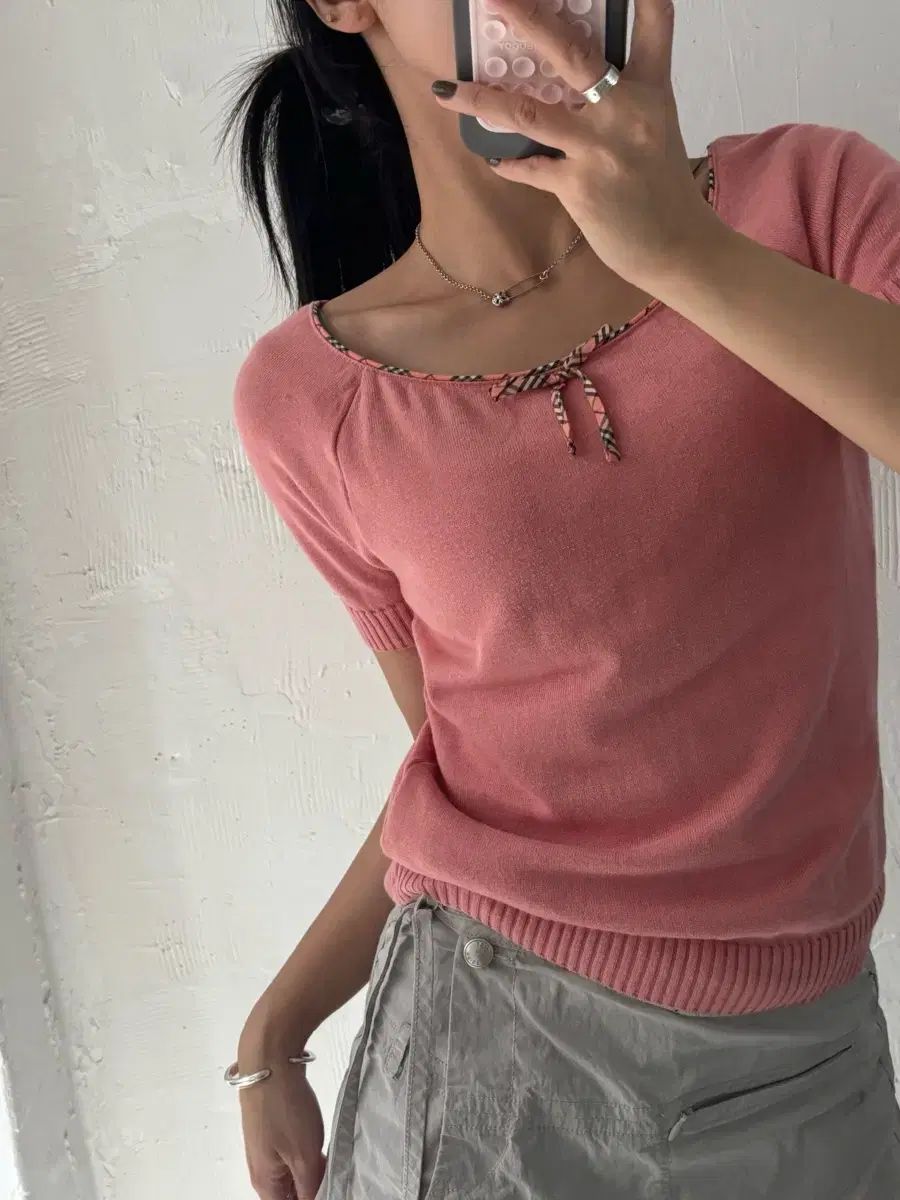 • これはバーバリーブルーレーベルの半袖ニットで、ネックラインのリボンのディテールが目立ちます:) 自然な使用感以外に大きな欠陥はなく、良好な状態です。