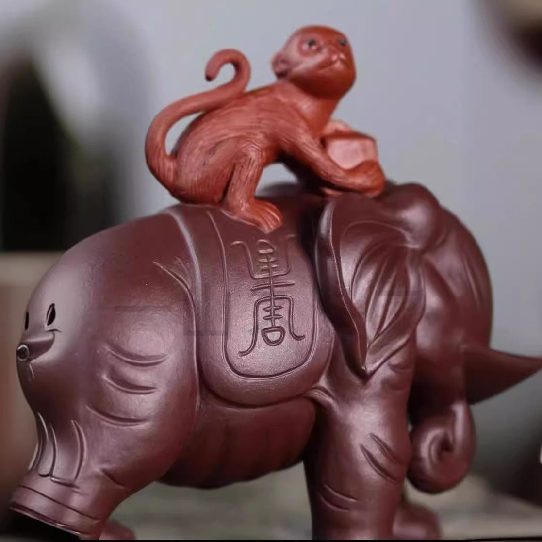 猿が象に乗っている紫砂の置物は、東アジアやインドの文化的象徴を取り入れた、特別なオブジェです。猿は知恵や機敏さを象徴し、象は力強さや安定を表す動物として古来より尊ばれてきました。この二つの象徴が一つの作品に組み合わされることで、「知恵と力の調和」をイメージさせるデザインとなっています。