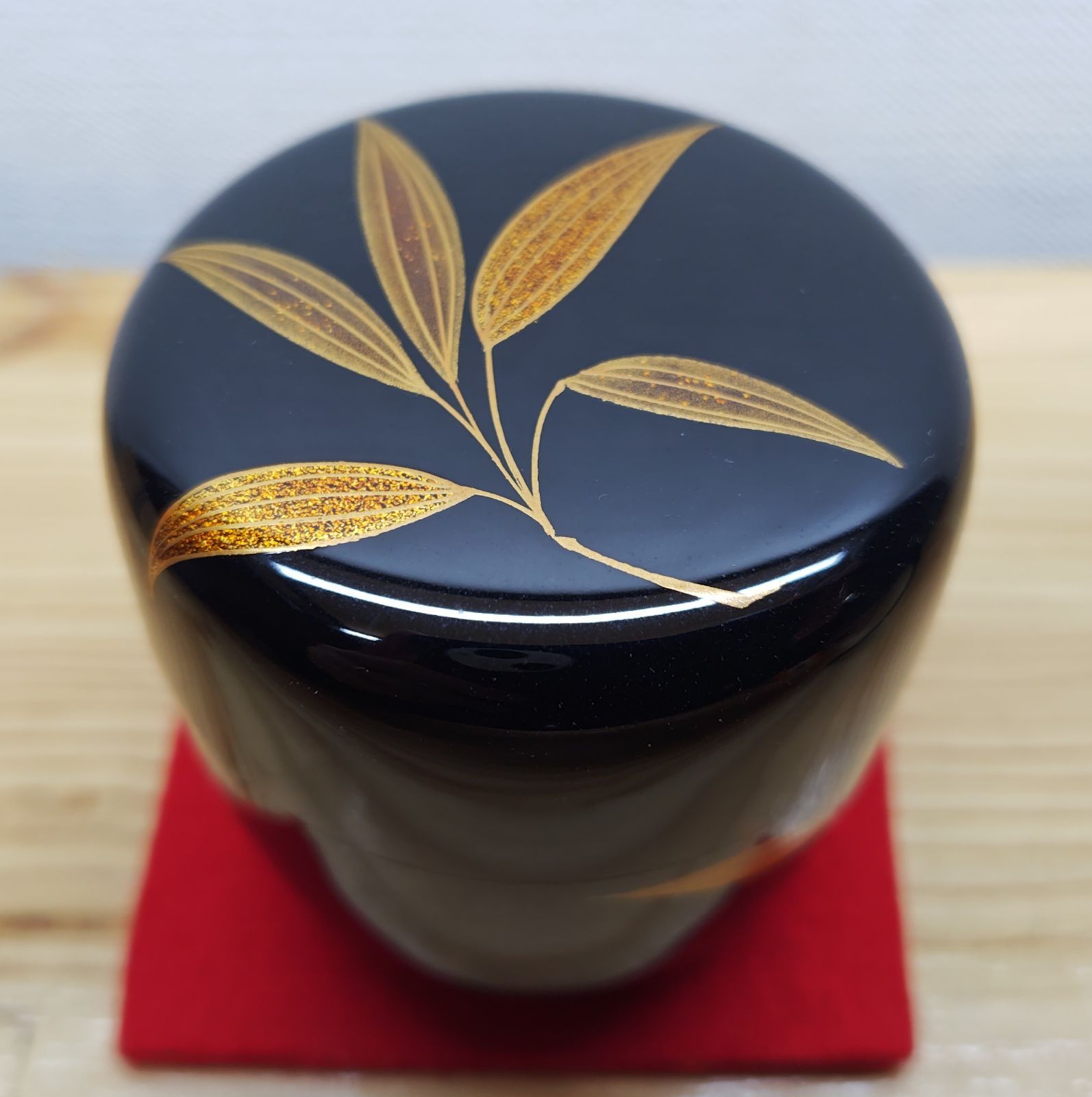 お正月などに良い若竹蒔絵の中棗で、塗の具合や蒔絵の綺麗さなど見た目も良い棗になっています。