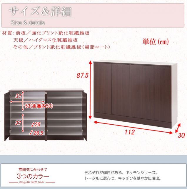 ■商品サイズ/本体:(約)幅112×奥行30×高さ87.5cm、扉内寸:左右扉内共通(約)幅53(兆番内50)×奥行26×高さ37(固定棚挟み上下共通)cm