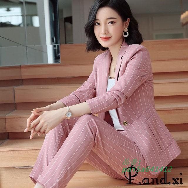 レディースファッション 大きいサイズ パンツスーツ レディース ピンク ストライプ 30代 2点セット 通勤 OL スーツ 40代 春秋 フォーマル オフィススーツ pai 5 a 641412