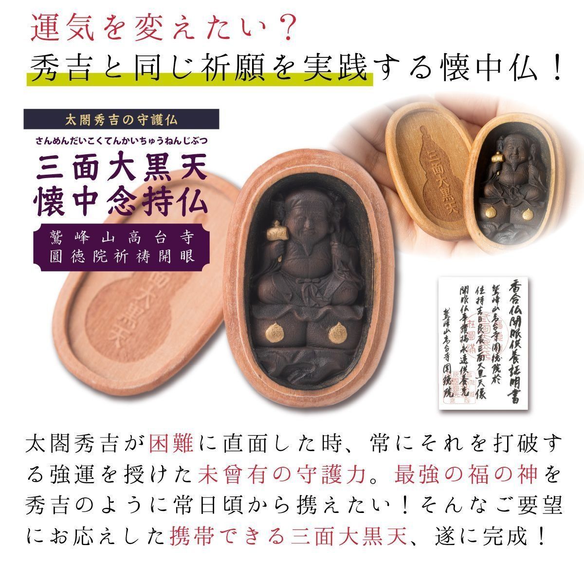 圓徳院開眼供養済み 三面大黒天懐中念持仏 ≫持ち運べる御守 壇木