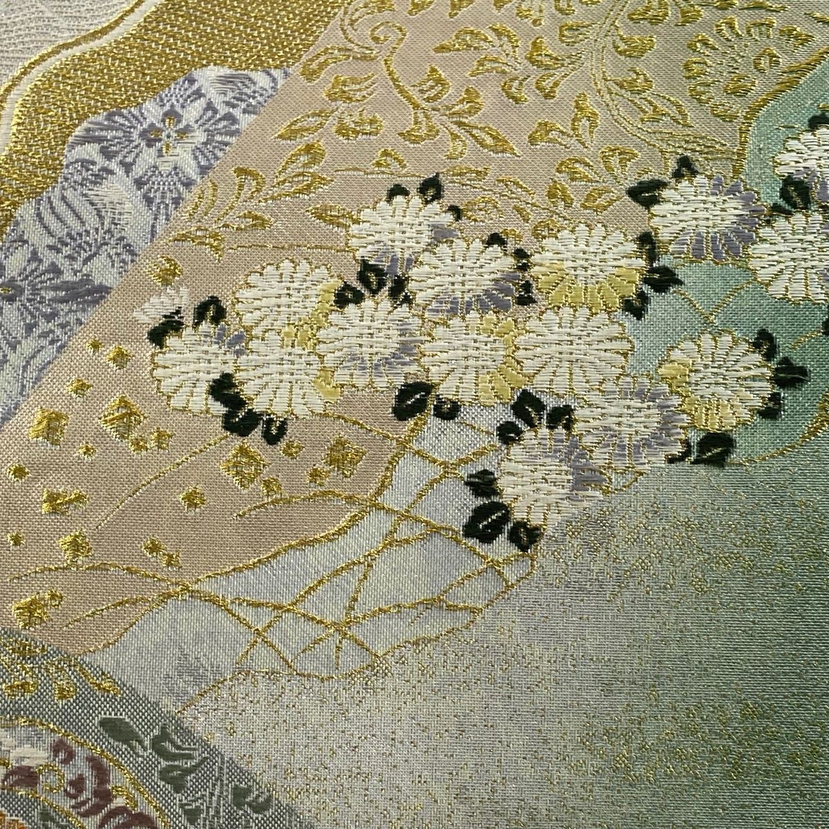 袋帯 秀品 遠山正倉文 花唐草 秋草 金糸 箔 薄緑 六通 正絹