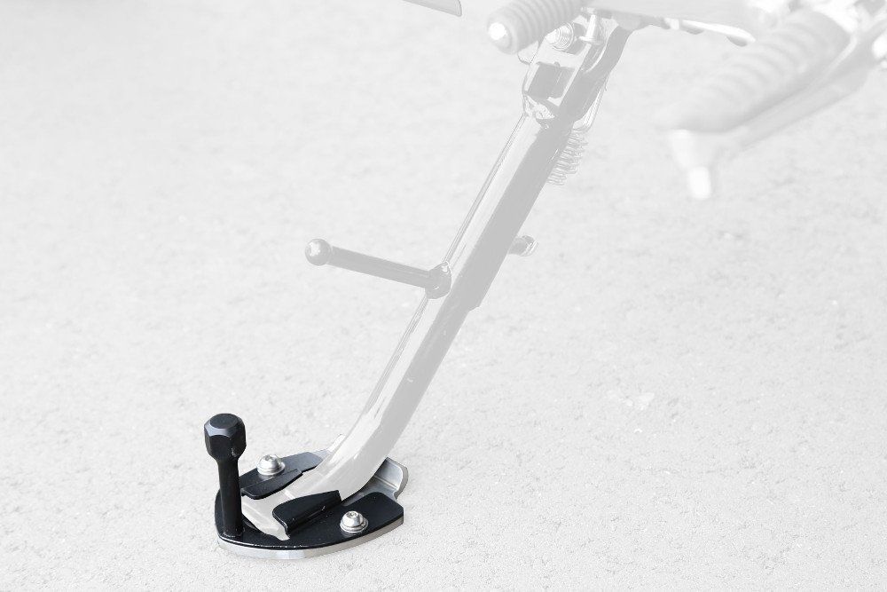砂地、未舗装地やアスファルト等でのサイドスタンドのメリ込みを防ぐワイドプレートの機能にスタンドの出し入れが楽になるエクステンション機能を加えたアイテム。