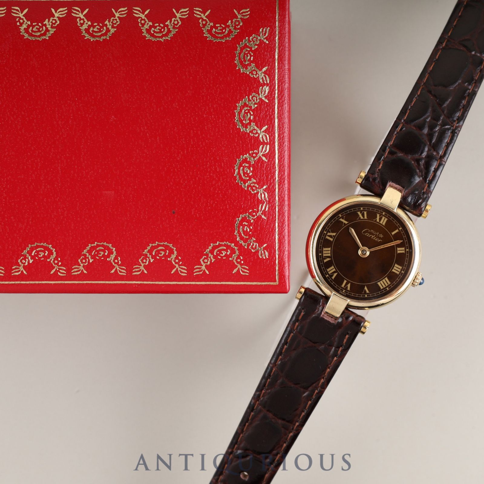 カルティエ マスト ヴァンドーム VLC SM 18 クォーツ Cal.81 SV 925 革 尾錠 GP マホガニーローマン文字盤 箱 オーバーホール済み