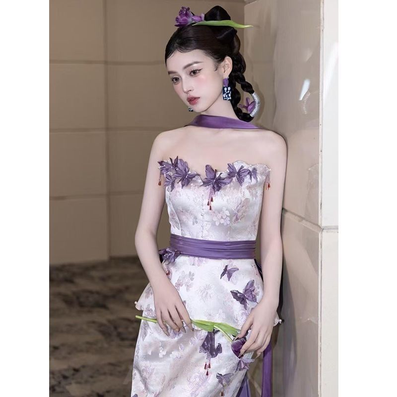 【送料無料】レディース 紫色 抹胸 ロングドレス 晨袍風 敬酒服 XS-3XL 結婚式 成人式 パーティー 高級感 小衆デザインWPまとめ買い割引103