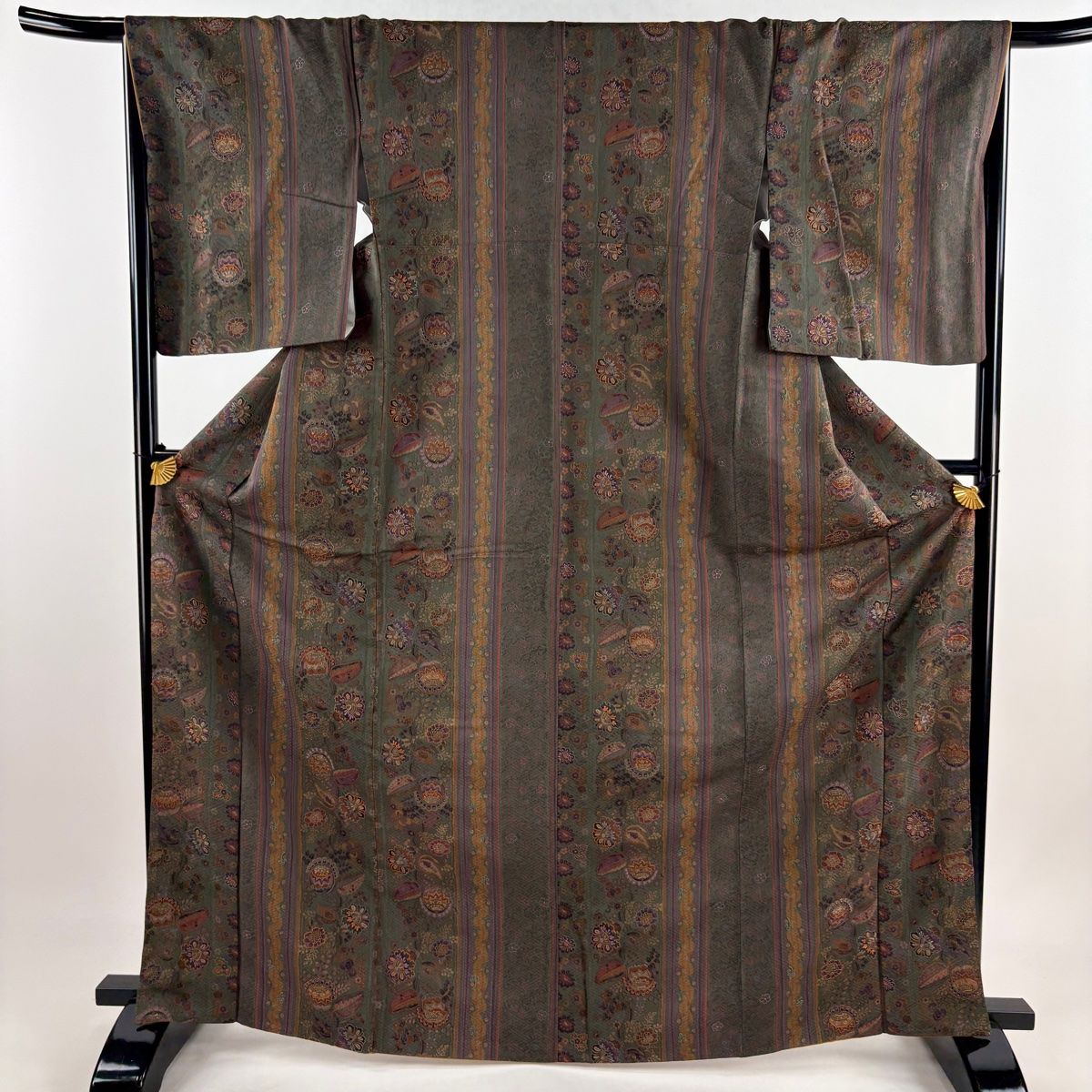 小紋 身丈167 cm 裄丈66 M 袷 やまと 花 縦縞 刺繍 金糸 灰緑 正絹 秀品