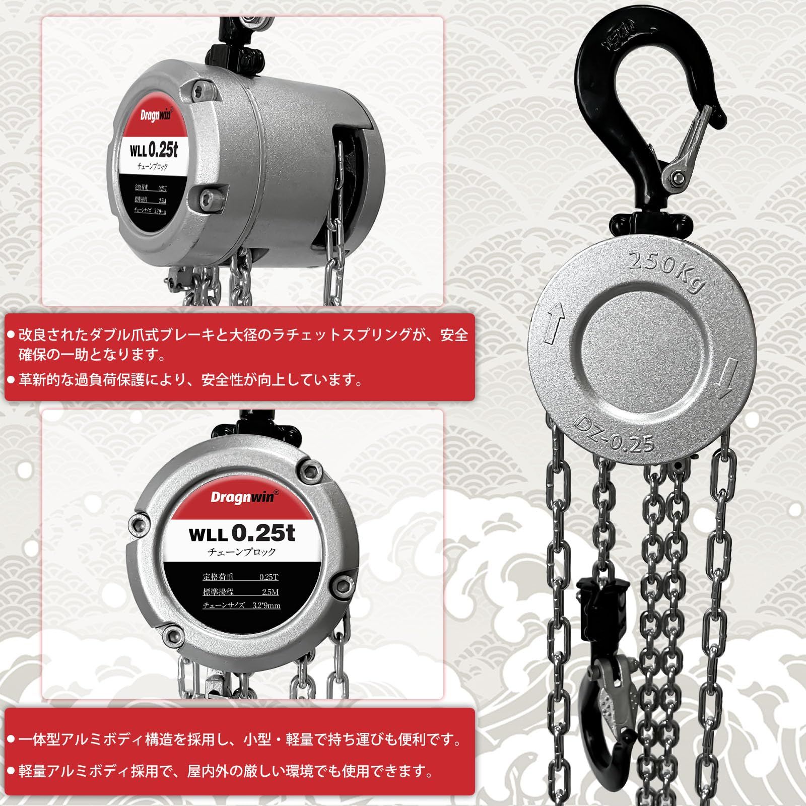Dragnwin チェーンブロック 250 kg 2.5 m チェーンホイスト レバーブロック 0.25 t 手動式 荷締機 ガッチャ がっちゃ レバー式ブロック アルミ製