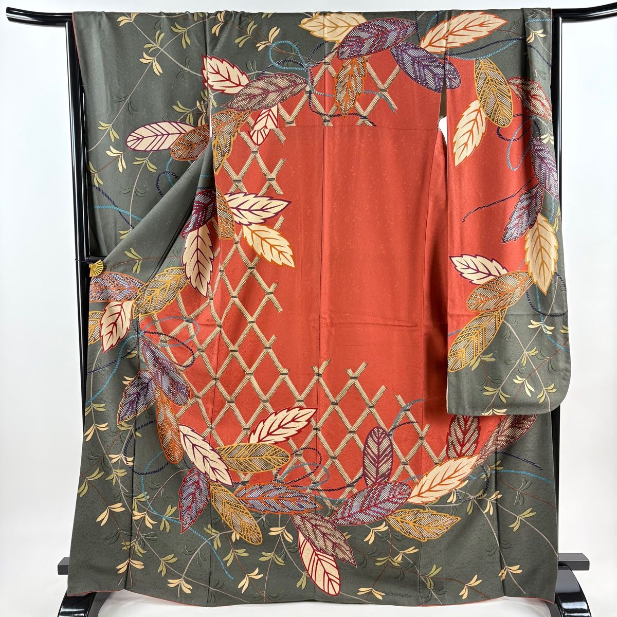 振袖 身丈169 cm 裄丈70 L 袷 葉 紐 金糸 刺繍 灰緑 正絹