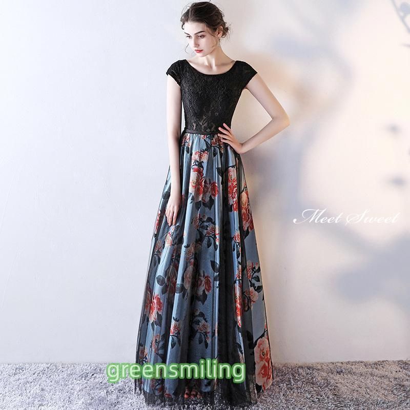 ドレス ロングドレス ブラック 黒 花柄 半袖 編み上げ ファスナー ウェディングドレス ウエディングドレス 大人 結婚式 二次会 披露