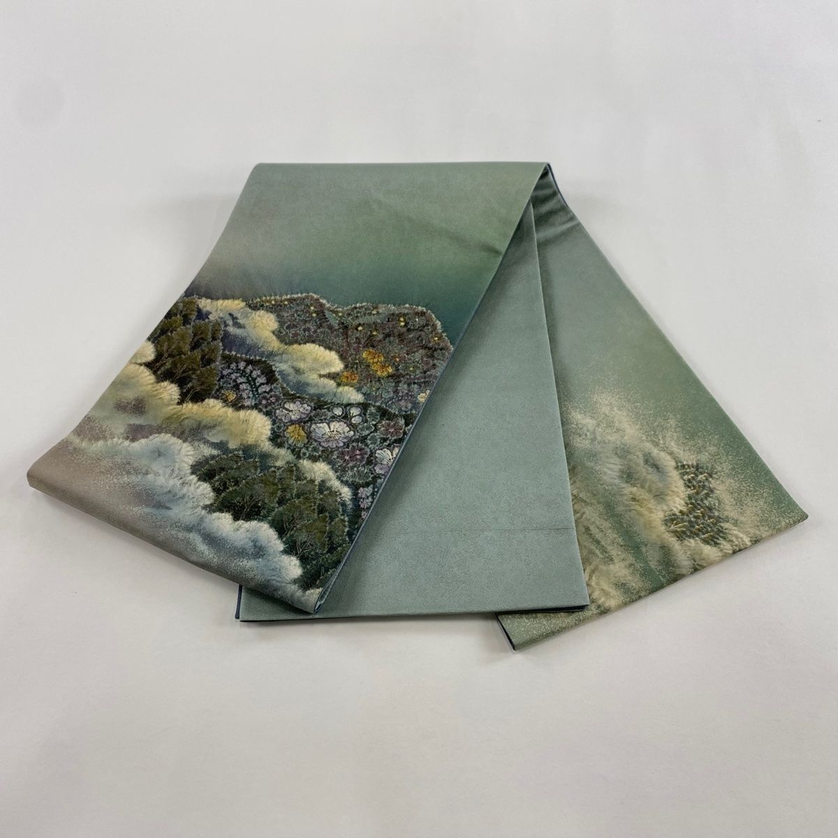 袋帯 吉乃一廉 落款 辻が花 雲文 金糸 ぼかし 灰緑 お太鼓柄 正絹