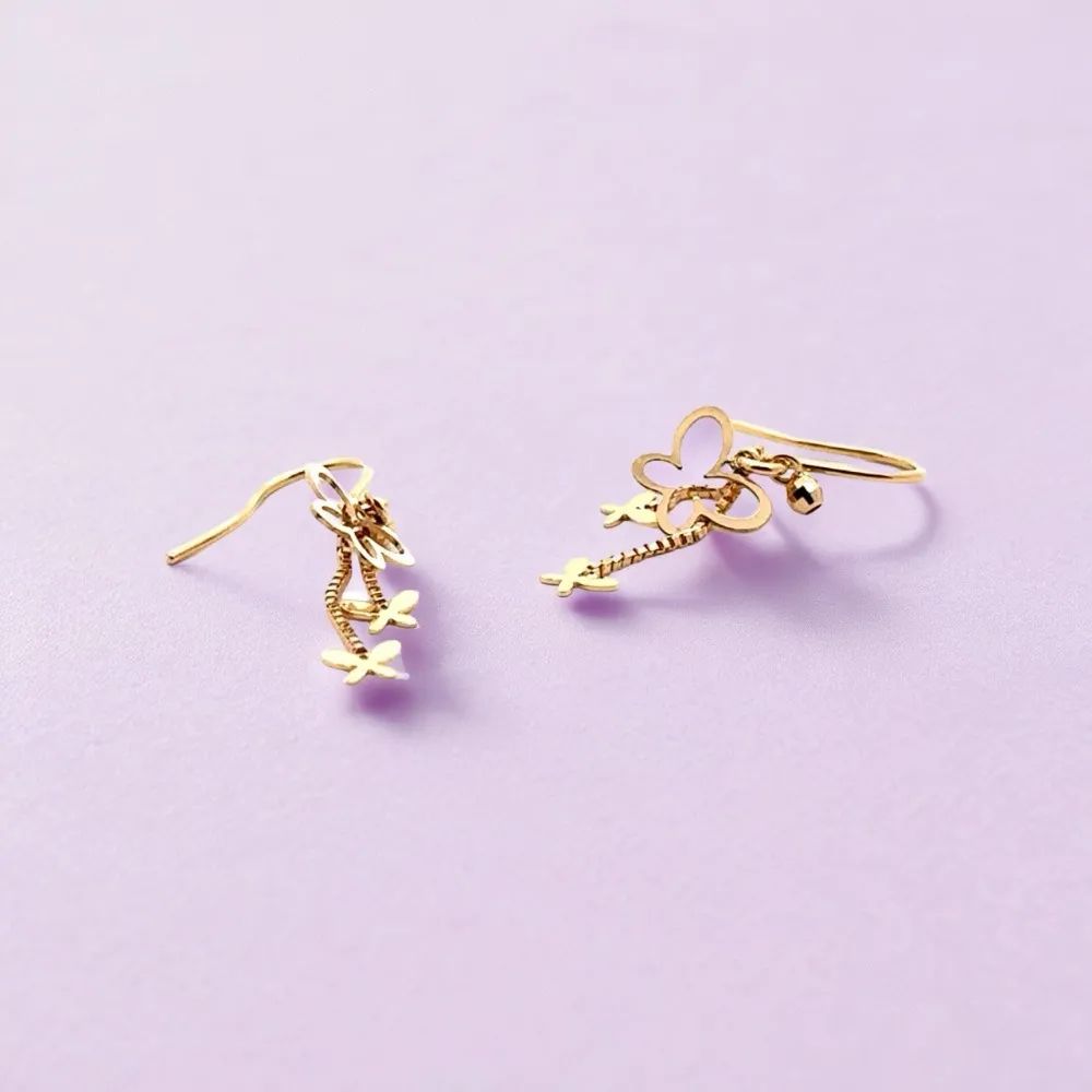 軽やかに舞う蝶をモチーフにした、K18イエローゴールドのロングピアスです。繊細なゴールドのチェーンに、大小2つの蝶が連なり、歩くたびに優雅に揺らめきます。耳元で繊細にきらめく光は、顔周りを華やかに、そして女性らしく彩ります。