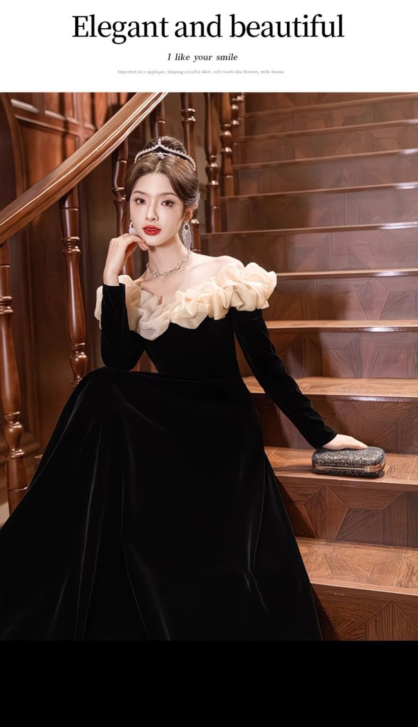 ドレス レディース ロングドレス 2025 黒 オフショルダー 長袖 晚礼服 感 小衆デザイン フレンチ風 エレガント パーティー 演奏会 発表会 結婚式 二次会 秋冬
