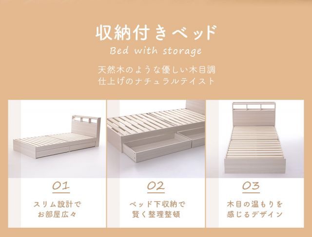 収納付きベッド ベッドフレーム シングル 組み立て式 すのこ 棚付き コンセント付き ヘッドボード 木目調 シンプル ナチュラル 収納 引き出し 寝具