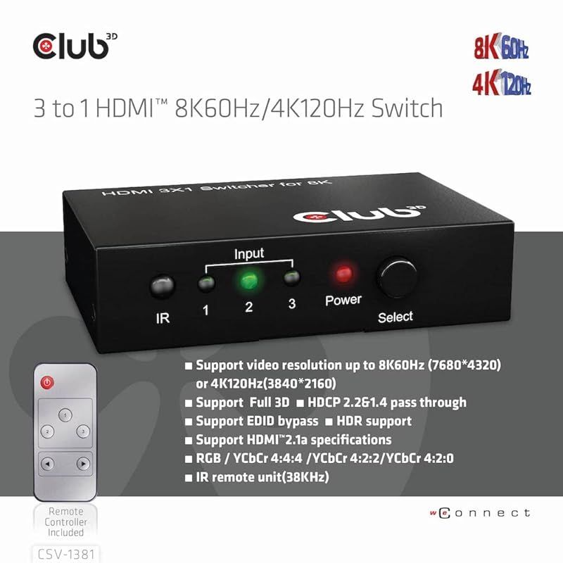 Club 3 D HDMI 8 K 60 Hz 4 120 3入力1出力 切替器 スイッチボックス Switch Box リモコン付き CSV 1381 0