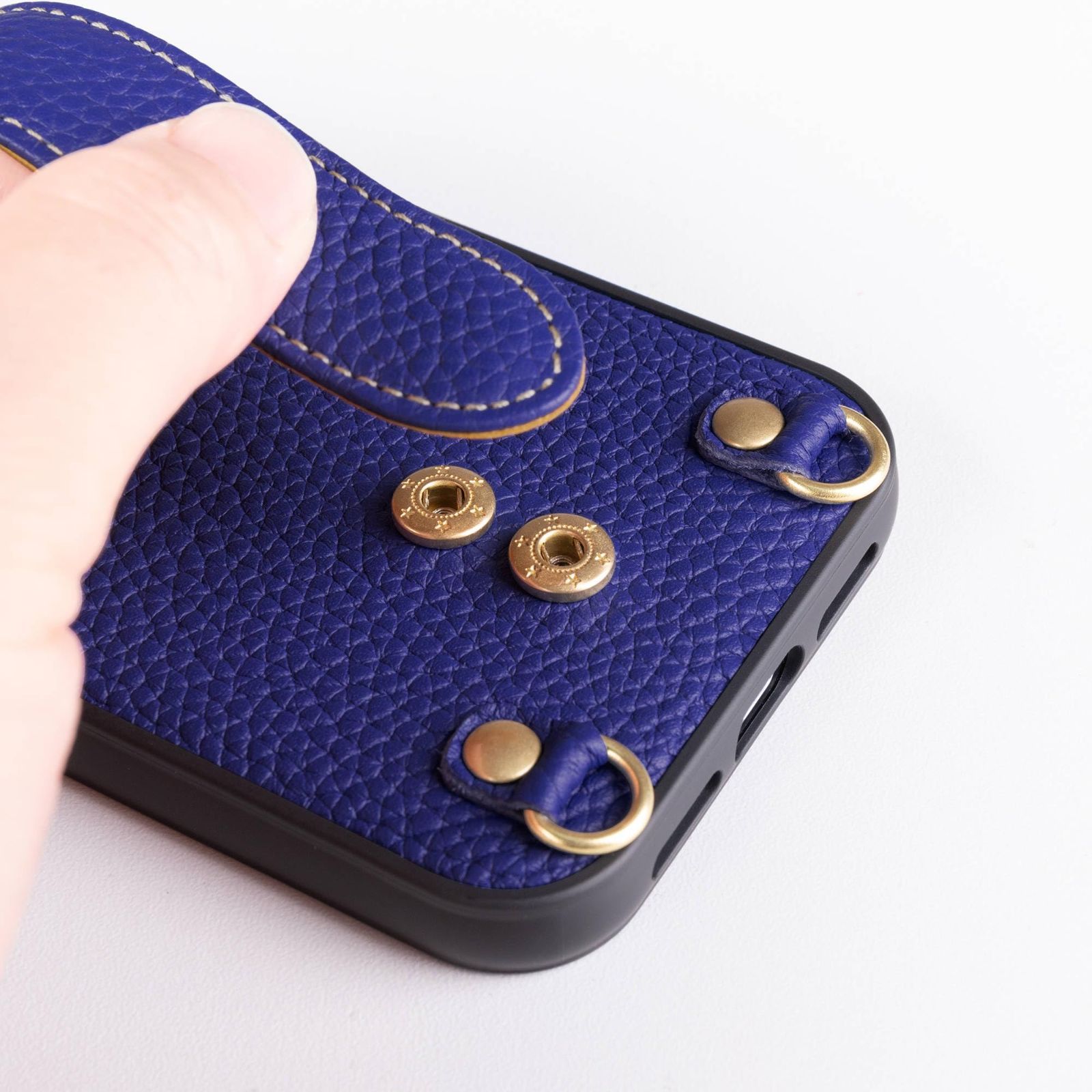 COGUREが独自考案した、斬新な落下防止ベルトデザインが特徴です。スナップボタンで簡単にサイズ調整ができ、ベルトがケースの中央に配置されており、左右から持ちやすいです。ベルトの表側はシュリンクカーフレザー、裏側はスムースレザーで、柔らかく滑らかな触り心地を提供します。