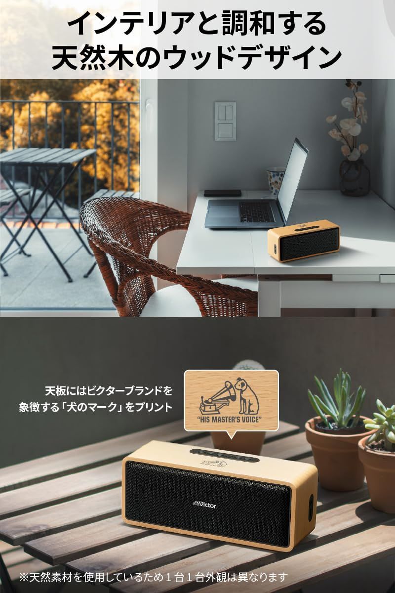 【天然木のウッドデザイン】スピーカー外枠に天然木※ を採用。インテリアアイテムとして天然素材ならではの質感が楽しめます。天面には Victor ブランドを象徴する「犬のマーク」をプリントしました。※:天然木を使用しているため、1台1台外観は異なります。
