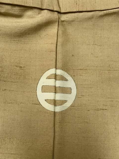 節の風合いの良い薄茶色地に、丸に二つ引きの三つ紋が入りました紋付着物。