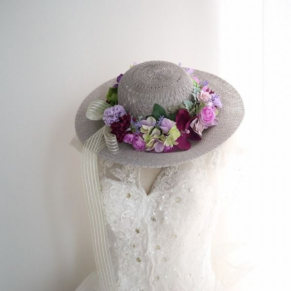 グレイッシュな色合いのハットに、パープルやピンク系のアーティフィシャルフラワーをたっぷりとあしらった、華やかなフラワーハットです。
