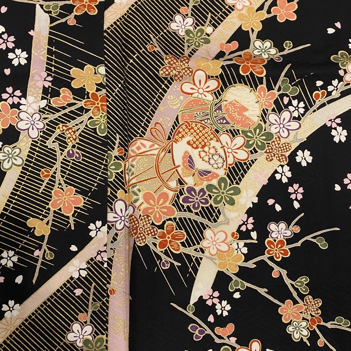小紋 身丈160 cm 裄丈65 M 袷 やまと 鼓 枝梅 金彩 黒 正絹 秀品