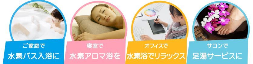 電気分解により発生する水素で、水素入浴や洗顔、洗髪、足湯、空気のリフレッシュ、アロマなどが楽しめます。