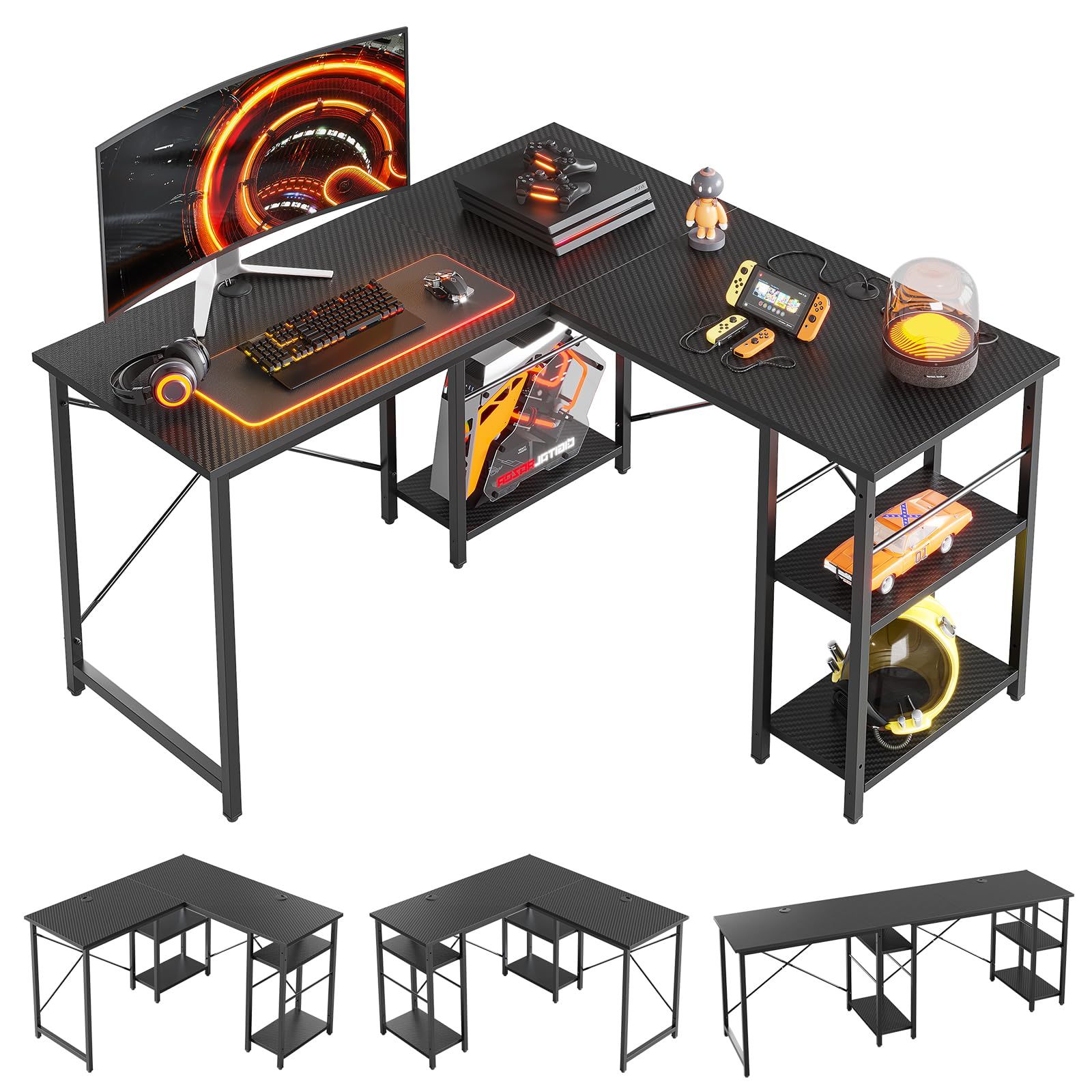 Bestier ゲーミングデスク l字 パソコンデスク 幅120cm×奥行120cm デスク l字 机 棚付き コーナーデスク 収納 棚板高さ調節可能 ゲームデスク オフィスデスク 仕事用 在宅勤務 カーボン調ブラック