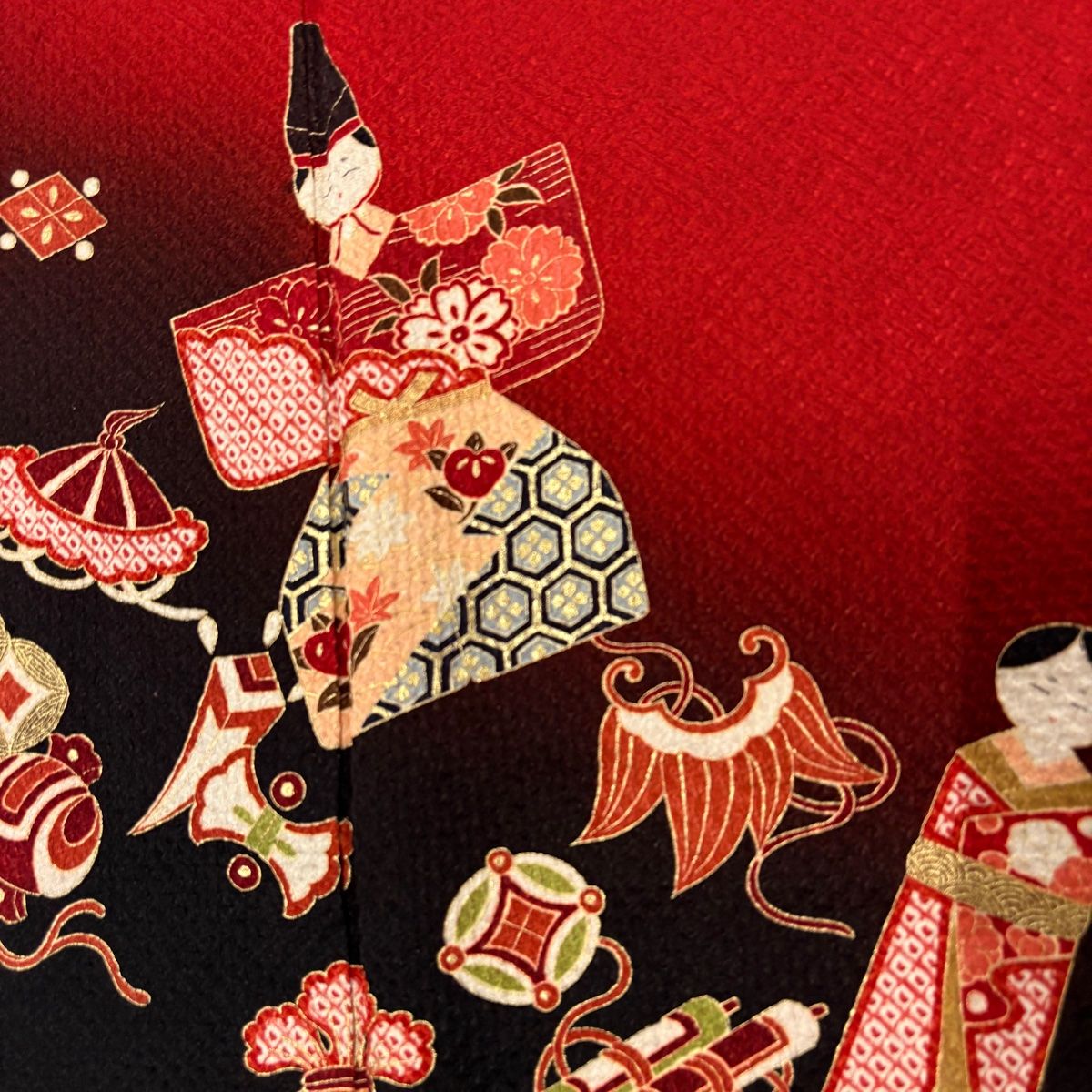 振袖 身丈161 cm 裄丈64.5 M 袷 雛人形 宝尽くし 金彩 絞り 赤 正絹 秀品