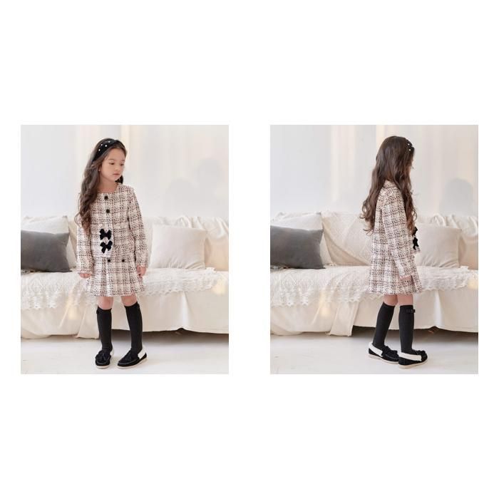 レトロな上品な華やかさを♪女の子が大好きなピンク色に 大人のモノトーンの配色のツイード地が大人の余裕すら感じさせる子供服Roraレトロツイードセットアップです。