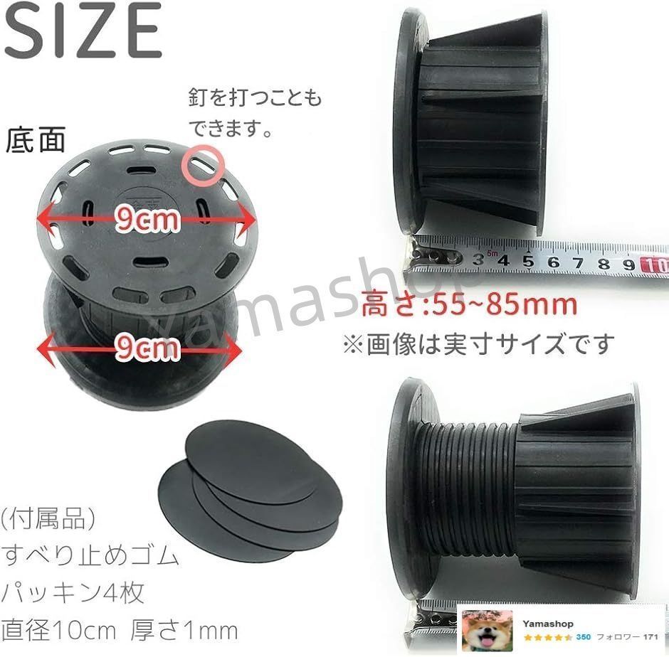 ・高さ 55?85mm 4個セット+すべり止めゴムパッキン4枚 重量106グラム/個 耐加重100kg/個 プラスチック製 上面、底面とも直径9cm (付属品)すべり止めゴムパッキン 直径10cm 厚さ1mm