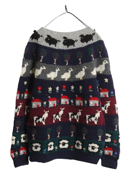 80 s デザイン ニット セーター メンズ レディース 古着 ヴィンテージ シェットランド ウール ノルディック アニマル イラスト 総柄 絵柄