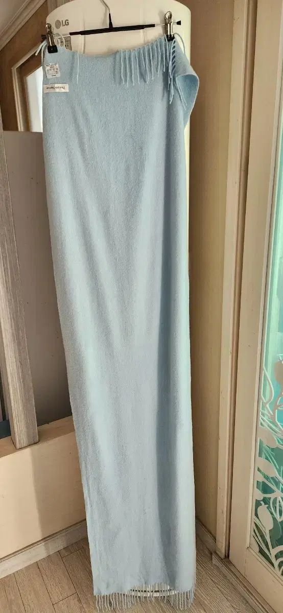 柔らかいカシミア100%素材のスカイブルーのマフラーです。