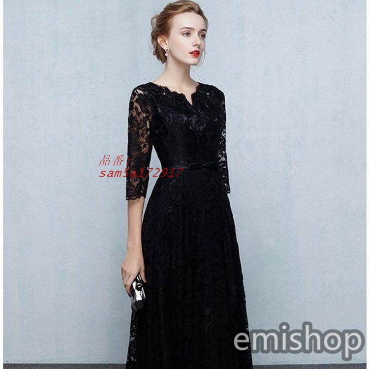 ロング丈レースドレス黒ブラック着痩せ7分袖パーティードレス結婚式二次会ドレスロングドレスフォーマルワンピースレース am 5 a 172917
