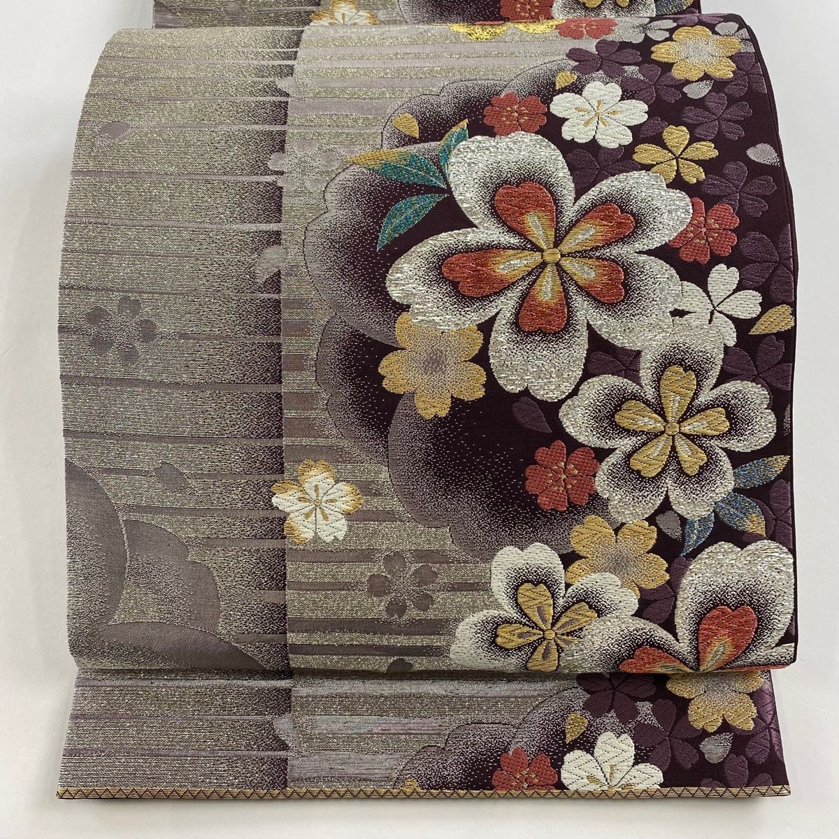 袋帯 秀品 桜 縞 箔 唐織 銀色 六通 正絹
