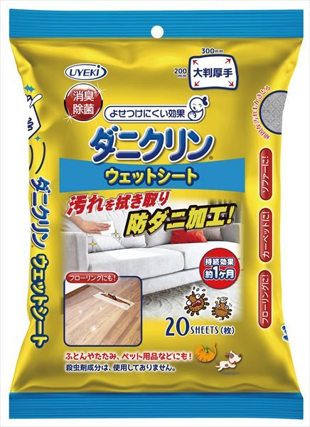 汚れを拭き取りながら防ダニ加工。ダニクリンウェットシート。カーペットやソファー、フローリングなどを拭くだけで、汚れを落として、消臭除菌、さらに防ダニ効果が1カ月持続します。殺虫成分不使用。