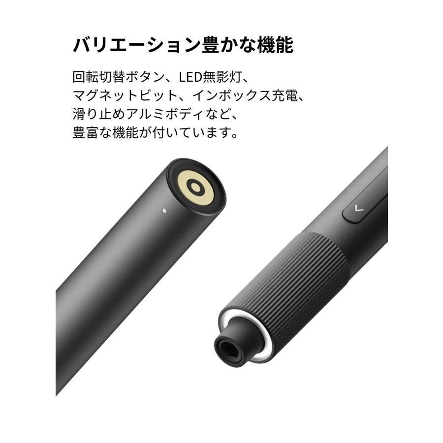 回転切り替えボタン、LED無影灯、マグネット式ビット着脱、インボックス充電、滑り止め加工済みアルミニウムボディなど豊富な機能が付属。