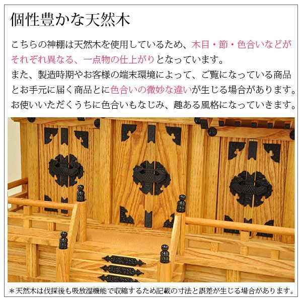 こちらの神棚は天然木を使用しているため、木目・節・色合いなどがそれぞれ異なる、一点物の仕上がりとなっています。