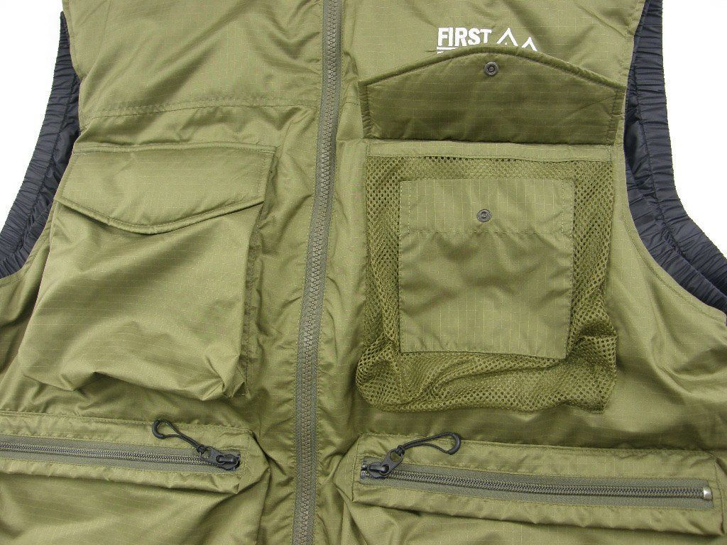 FIRST DOWN ファーストダウン 軽量 ダウンベスト MULTI POCKET VEST DICROS MAURI RIP 撥水 透湿 防風 ディクロス マルチポケット オリーブ | 秋冬