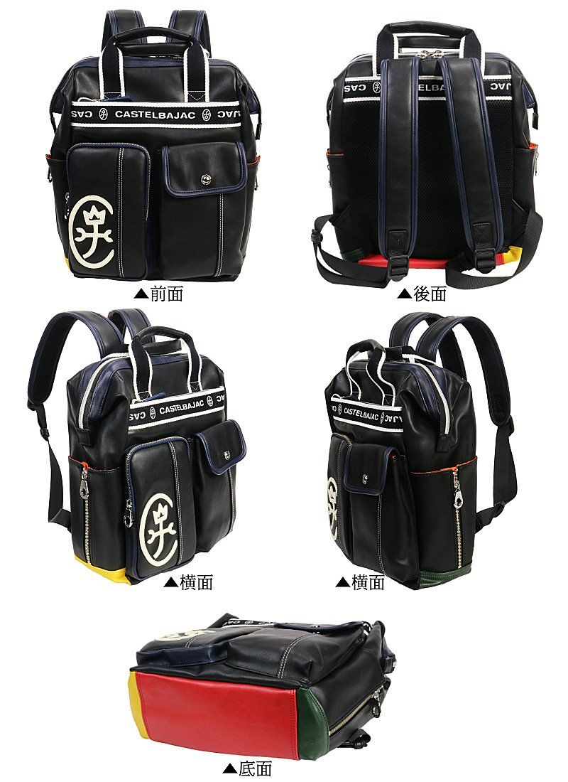 カステルバジャック(CASTELBAJAC)のリュック。[ポイント]ベーシックな本体カラーにカステルバジャックらしい4原色がちらりとのぞく配色がポイントのカジュアルリュック。マチ付きの便利な外ポケットや880gと軽量な仕様にくわえ持ち手付いているのも魅力です。大きな開口部からペットボトルやA4ファイルなどをすっぽりと収納できます。[機能・収納]● 前面ファスナーポケット● 前面ファスナーアウトポケット (約 幅12.5×高20cm)● 前面カブセポケット(約 幅12.5×20 cm)● 両サイドポケット(約 幅12×高20 cm)● ファスナーポケット● 3段仕切りポケット[型番:24711]