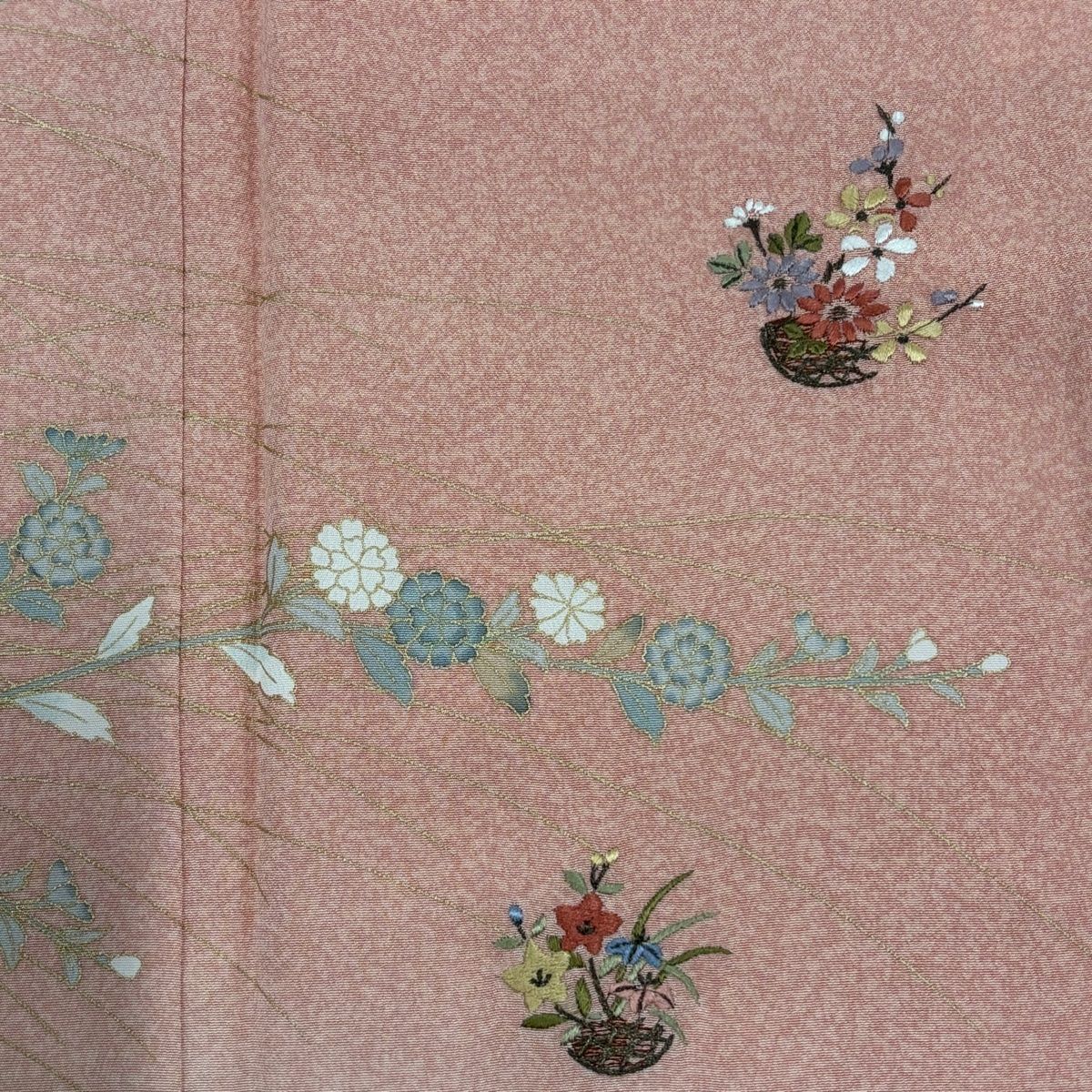 付下げ 身丈154.5 cm 裄丈63 S 袷 落款 花籠 芝 刺繍 金彩 ピンク 正絹 秀品