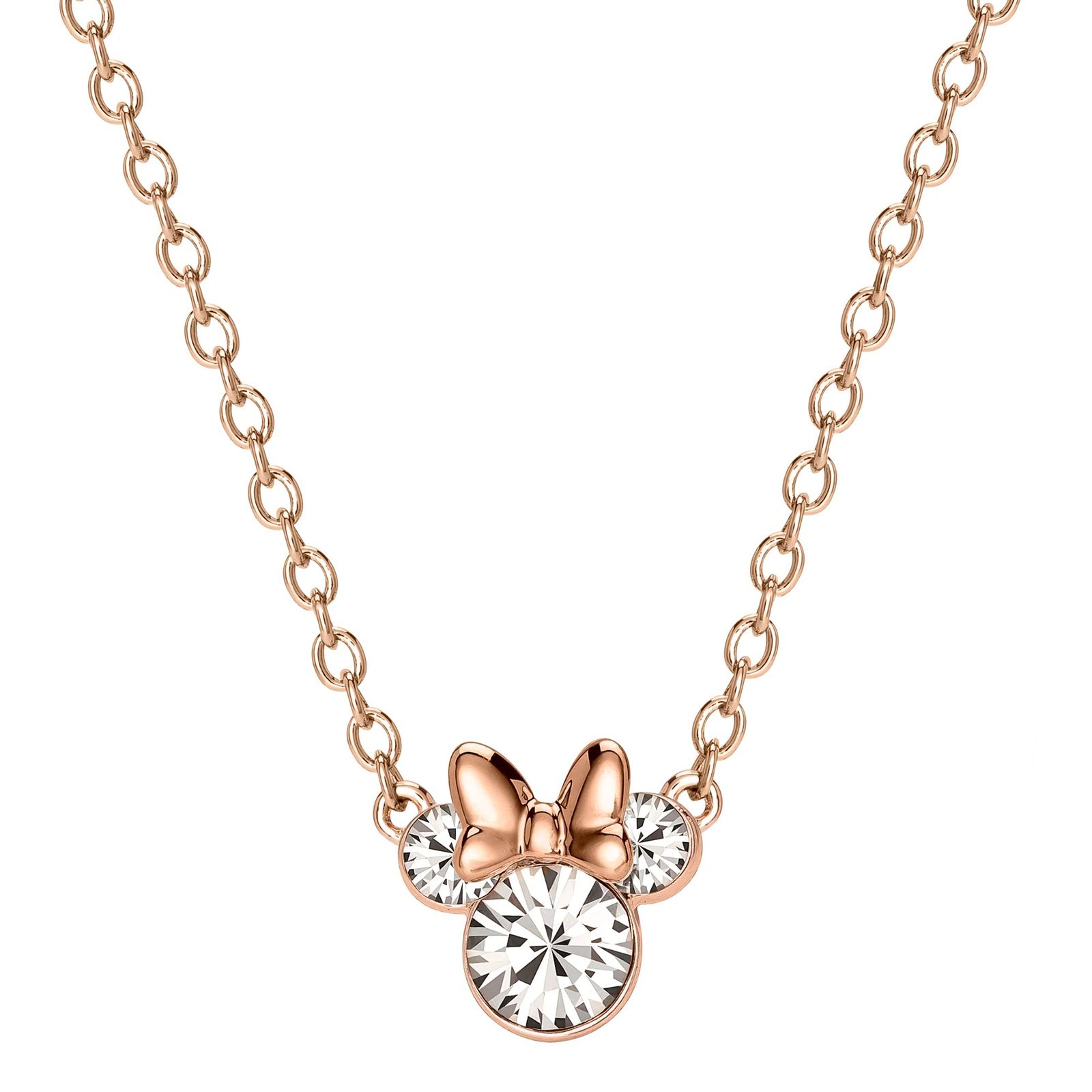 ディズニー公式ライセンスジュエリー:ローズフラッシュメッキミニーマウスペンダントネックレスは、瞬時に認識できるミニーアイコンが光るクリアクリスタルで飾られています